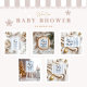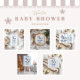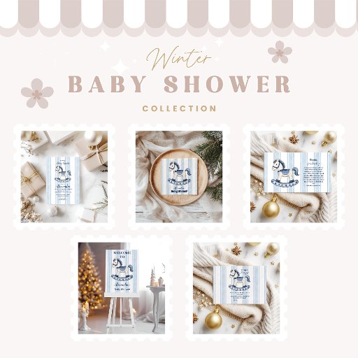 Um doce cavalo de balanço de aquarela toma o palco central neste charmoso design chá de fraldas. Colocada contra um fundo azul suavemente riscado, esta ilustração evoca uma vibração clássica no berçário com uma reviravolta festiva de inverno, perfeita para celebrar a chegada de um pequeno.