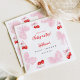 Coquette Cherry Chás de fraldas. Apresentando um delicioso tema de cereja, elegante roteiro vermelho e arcos cor-de-água rosa macio, este design é perfeito para uma celebração de cereja elegante.