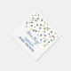 Personalizável, é um guardanapo para chá de fraldas em azul escuro marinho e padrão de confetti dourado e texto escrito à mão.