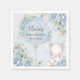 Personalize este guardanapo de chá de fraldas de menino branco fácil e rapidamente, simplesmente clique no botão personalizar para editar os textos, alterar as fontes e as cores das fontes. Projetado para captar a essência da alegria e da antecipação, esse convite encantador apresenta um adorável elefante para bebês, acompanhado pela elegância suave dos rosas azuis para bebês e delicados arranjos florais. Um toque lúdico é adicionado com um balão de aquarela, onde você pode colocar seus detalhes de personalização. Itens correspondentes disponíveis no repositório. c) Paperie fina somerset