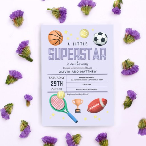 Este bonito e moderno "um pequeno super-astro está a caminho" chá de fraldas de guardanapo para meninas apresenta um design de cartum esportivo roxo, com basquete, futebol, bola de futebol, raquete de tênis, troféu e estrelas. O guardanapo pode ser personalizado com os nomes dos pais e a data da sua festa. A perfeita adição com o tema desportivo ao chá de fraldas das vossas meninas.