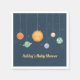 A festa do chá de fraldas temático espacial fornece rabiscos do sol e planetas incluindo o planeta Terra com nuvens como sobrancelhas. Fundo de estrelas pequenas sobre um fundo azul escuro. Design colorida e alegre para uma festa chá de fraldas! Personalize com a mensagem do seu partido.