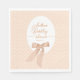 Tema do chá de fraldas de Arco de pêssego com crachá oval para nome e data, destaque de arco de gingham em um fundo de bolinhas.