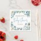 Flores brancas e alegres e folhas verdes de aquarela formam uma bela borda em bonito guardanapos azuis de chá de fraldas floral. Um guião moderno e manuscrito para o seu brunch de jardim ou chá para uma mãe grávida esperando um menino. Um belo decoro para uma festa de chá da tarde.