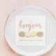Bonjour! Adicione um toque de estilo parisiense ao seu chá de panela com estes bonito guardanapos. Design apresenta quatro deliciosas ilustrações macarônicas francesas em cor-de-rosa pastel, marfim, tan e amarelo-pálido, com "Bonjour" em letras escritas à mão cor-de-rosa-pêssego. Personalize com o nome do convidado de honra para um toque personalizado.