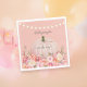 Chá os convidados na festa do chá de fraldas com esses designs de abóbora florais elegantes. Abóbora-rosa embebida em flores cor-de-rosa, corais e amarelas por baixo, fita-rosa e luzes de cordas por cima sobre um fundo rosa-claro.