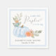 Guardanapos bonitos e bonito para o chá do seu bebê apresentando "A Sweet Little Pumpkin Is On Your Way" escrito em uma mistura de tipografia azul moderna e um roteiro de na moda com uma haste cardíaca, e um buquê de aquarela de uma abóbora azul pastel, florais laranja e verde. Personalize o nome da mãe e a data do chá em uma simples tipografia moderna de cinzas de luz.