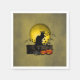 Uma silhueta do gato preto de Théophile Steinlen para o clube do Le Chat Noir num cenário moderno com uma lua amarela brilhante, muro de cinza com pinto, e duas lanternas-de-jack.