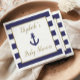 Este guardanapo para chuva de bebê marítimo apresenta uma âncora azul marinho em um retângulo com borda dourada falsa sobre um fundo de listras azuis marinho e branco. Dentro do retângulo, o nome da futura mamãe e as palavras "Chuva de Bebê" aparecem em tipografia cursiva dourada falsa. Ideal para uma chuva de bebê de menino. O texto é completamente personalizável. Veja nossas coleções para suprimentos de chuva de bebê combinando.