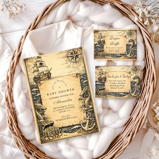 This pirate baby shower design features a whimsical storybook illustration with playful pirate children, tropical palms, treasure chests, and a vintage parchment map at the center. Inspired by classic children’s book art, the warm color palette and detailed scene create a fun, adventurous atmosphere without feeling cartoonish. Ideal for parents who love nautical themes, pirate adventures, and timeless illustrated styles, this design is fully customizable for your celebration details.