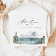 A Coleção Clover apresenta uma pintura aquosa de um lago de montanha com pinheiros verdes rústicos e uma fonte elegante de script. Tão perfeito para o seu chá de fraldas temático da montanha ou aventura.