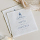These elegant New England coastal blue wedding napkins feature a hand drawn toile-style lighthouse and delicate calligraphy script uniting the names of the bride and groom.