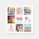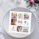 Um guardanapo para uma festa de aniversário feminina de 90, celebrando sua vida com uma colagem de 8 fotos suas. Modelos para um nome, 90 anos e uma data. Data de nascimento ou data da festa. Coral e letras coloridas burladas. Fundo branco.