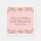 Malhas florais cor-de-rosa com pincel elegante, fundo com rendas florais douradas e texto personalizável em castanho sugerido para - Salve a data.