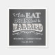O popular design de casamento em forma de quadro negro recebe um efeito de giz sobre o fundo e mostra tipografia caprichosa que diz: "Vamos come, bebe e se casa". Personalizado com os nomes da noiva e do noivo e a data do casamento. Também disponível sobre fundo preto sólido ou com letras negras sobre fundo branco.