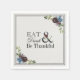 Este design de guardanapo de papel de Natal de Ação de Graças convida seus hóspedes a Comer, Beber e Ser Agradecido. Um grande e embelezado com um buquê floral de cor d'água em cores ricas em outono, de burgundy, marinho azul, rosas claro e verde destaca o texto. Os buquês de canto coincidentes adicionam um pop de cor sobre o fundo neutro de cintura bege. Este design de guardanapo está disponível em vários tamanhos, incluindo guardanapos, guardanapos de almoço e guardanapos jantes.