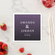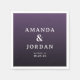 Este design de guardanapo de casamento apresenta um fundo roxo em gradiente com tipografia moderna e limpa. O layout é simples e sofisticado, usando fontes serifadas para os nomes e sans-serif para detalhes adicionais, criando um contraste equilibrado. Perfeito para adicionar um toque de classe ao seu casamento, este design exala um clima formal, mas acessível, tornando-o ideal para celebrar o amor com estilo.