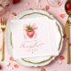 O guardanapo do Primeiro Aniversário da Coquette Berry captura a doçura e alegria de celebrar o primeiro ano da sua menina, misturando o charme lúdico com elegância eterno. No coração desta design está um delicioso motivo de morango, simbolizando o início fresco e vibrante da infância. O vermelho rico dos morangos é perfeitamente balanceado por matizes cor-de-rosa macio, criando uma paleta tenra e alegre que dá o tom para uma festa de 1º aniversário da fruta.