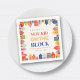 Tema do chá de fraldas "New Kid On The Block" com texto no centro com casas coloridas na fronteira de vizinhança.
