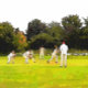 Um simples design de arte de uma partida de críquete de uma vila de domingo à tarde.