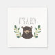 Woodland temeu o design de bebê de Shelby Allison apresentando uma ilustração de designs florais verdes e caprichosos em volta de um retrato de filhote de urso doce com a palavra "é um menino".