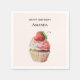 Guardanapos de papel com uma ilustração brilhante com um cupcake delicioso. Sorvete branco e um morango grande adoram este doce doce doce.