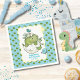 Serve up refreshments with a touch of prehistoric charm using our adorable Cute Hatching Dino Baby Shower Paper Napkins featuring a sweet baby dinosaur just peeking out from its egg, joined by a cheerful little bird. The vibrant blue background is adorned with playful green footsteps accents, perfectly complementing your dinosaur-themed baby shower.