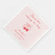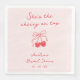 Guardanapos temáticos para chá de panela em estilo retrô vermelho e rosa com ilustração desenhada à mão de um par de cerejas encimadas por um laço coquete e a frase "Ela é a cereja no topo" em fonte manuscrita. Personalize com o nome da noiva e a data do chá.