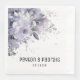 Um cinzeiro prateado e malvado guardanapo com uma aquarela floral de mauve e cinza de prata verde de eucalipto com salpicos e panos de tinta prateada com seus nomes e detalhes em uma fonte moderna de san serif.
