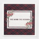 Bandeja bonita e elegante com borda de xadrez vermelha e preta e sotaque floral.