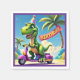 Um vibrante dinossauro de desenho animado, fazendo um chapéu de festa, cruza uma estrada ensolarada em um patinete roxo. A cena é colocada contra o pano de fundo das palmeiras e das nuvens peludas, com uma faixa de aniversário flertando na brisa. Esta imagem brincalhona captura o espírito de celebração e aventura, perfeito para uma festa de aniversário.
