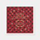 Os bonitos guardanapos de Natal apresentam um fundo festivo vermelho, flocos de neve com brilho dourado, uma tipografia com brilho dourado e folhas de árvores.