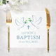 Dove e Christian atravessam guardanapos de batismo em azul e branco.
