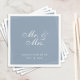 Guardanapos de casamento para um casamento com cor azul empoeirada. Apenas texto branco sobre fundo azul empoeirado. As palavras "Sr. A & Sra." está escrita num guião caligráfico elegante, os nomes da noiva e do noivo e a data em bonés menores.