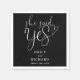 Este guardanapo de festa de noivado com a elegante escrita preta e branca "Ela disse sim" pode ser personalizado com seus nomes e data especial. Criado por Thisisnotme©