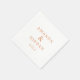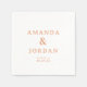 These wedding napkins feature a minimalist design with a clean, centered layout on an off-white background. The names are elegantly displayed in large serif letters, while the location and date appear in a simple sans-serif font, creating a balanced contrast. A soft peach color palette adds warmth and sophistication to the overall look. Perfect for adding a touch of understated elegance to your wedding reception, these napkins emphasize clarity and refinement through thoughtful typography and a restrained aesthetic.
