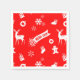 Um conjunto de guardanapos de papel com a repetição uniforme branca de elementos de Natal - meias, gingerbreadman, flocos de neve, renas, Enfeites de natal, velas, árvore de Natal e as palavras "Feliz Natal" - a título ilustrativo, contra um fundo vermelho.