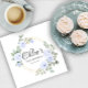Um guardanapo personalizado perfeito para a sua 100ª festa de aniversário. Rosas azuis empoeirados são aninhados em folhas de eucalipto que decoram uma fina estrutura geométrica dourada. O nome do celebrante está escrito em um texto grande e adorável.