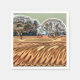 Um desenho abstrato e divertido de campos e árvores arados (arados) ao fundo, uma típica paisagem rural.