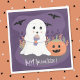 Alguns guardanapos de papel roxo e divertidos do Halloween com um fantasma a pendurar num latte de picante de abóbora frio. Personalize-os com o seu próprio texto. Procure pratos e copos de papel correspondentes. © ArianeC Ilustrações — Todos os direitos reservados