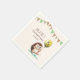 Os guardanapos de aniversário de um garoto adorável com um belo ouriço alegre segurando um balão com fundo de bandeira da festa.