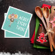 A gengibre balançada balançando-se em uma roupa colorida de inverno com texto branco empilhado de "Feliz Tudo" sobre fundo aqua.