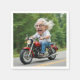 Um idoso com traços exagerados caminha alegremente uma moto vermelha pela estrada da floresta