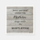 Este guardanapo de feriado divertido é acentuado com a citação fofa, O que acontece sob o visco permanece sob o visco, em um fundo de placa de madeira envelhecida, dando-lhe um sentimento rústico do campo.