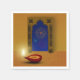 Feliz Ilustração Diwali: diya vermelha (uma lâmpada de óleo índio em forma de xícara) em frente a uma janela ornamental indiana com fogos de artifício do lado de fora.