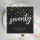Os guardanapos modernos de festa de aniversário com fundo preto na moda, confete dourado, o título 'setenta' numa letra branca, o ditado 'feliz aniversário', o seu nome e a data da celebração.