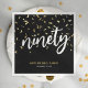 Os guardanapos modernos de festa de aniversário com fundo preto na moda, confete dourado, o título 'noventa' numa letra branca e negrito, o ditado 'feliz aniversário', o seu nome e a data da celebração.