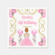 Este convite de guardanapo de aniversário apresenta uma elegante estrutura de ouro, uma bela princesa com cabelo vermelho e um vestido rosa, flores e um balão. Isto é perfeito para uma festa de aniversário.