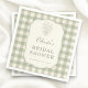 Guardanapos para festa de chá de noiva projetados com um padrão de xadrez verde sálvia suave. A aparência limpa e clássica funciona bem para temas de chá de noiva inspirados em jardins e atemporais. Adequados para chás de noiva, almoços e celebrações pré-casamento. Texto totalmente personalizável com design pronto para impressão para guardanapos de coquetel ou almoço.