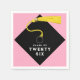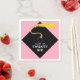 Guardanapos criativos para festa de formatura para formandos de 26 com linha engraçada e clássico chapéu de formatura preto com borla dourada em fundo rosa.